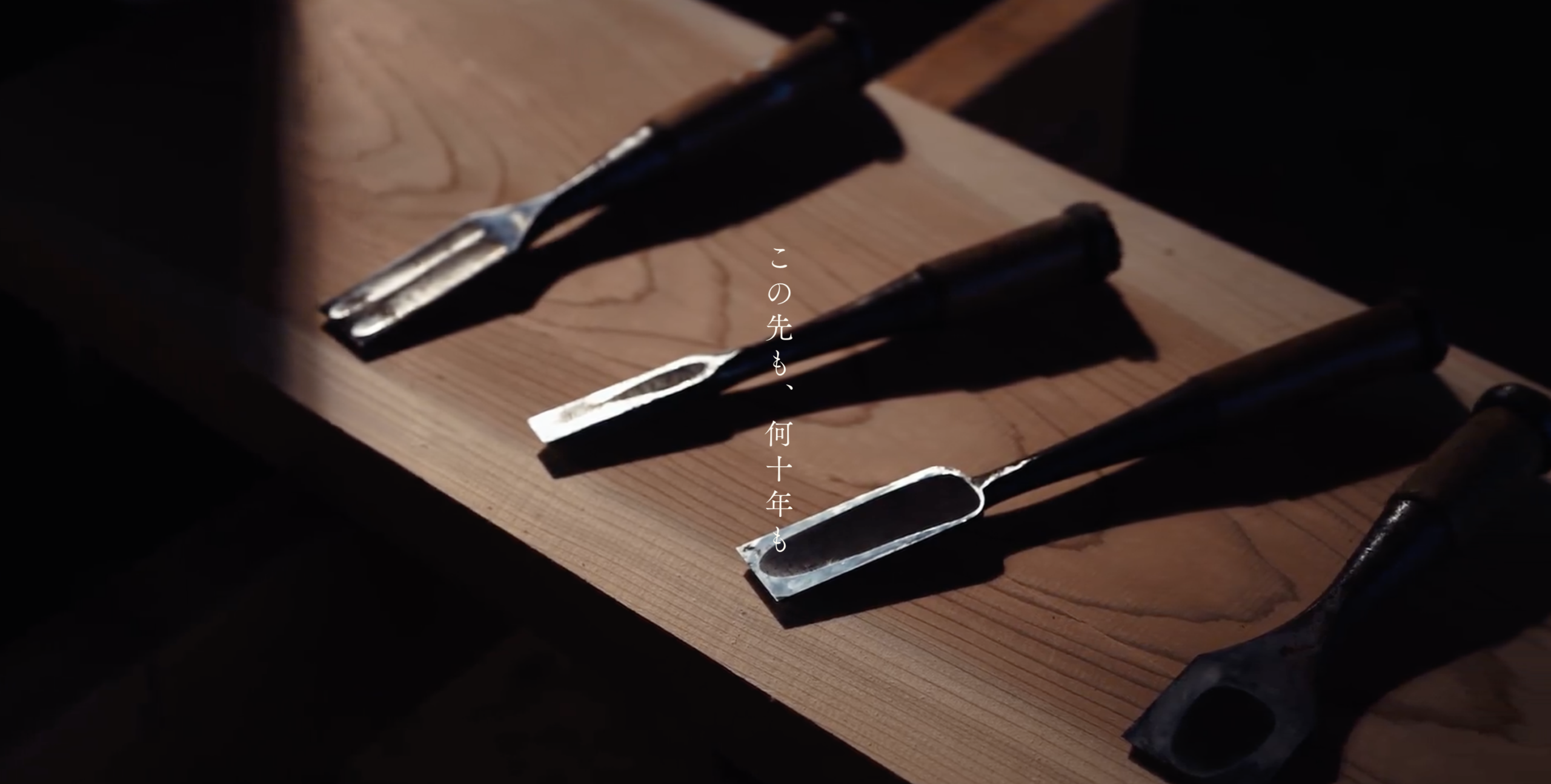 トップページを開いた瞬間、映し出されるのは、武家屋敷の古民家改修工事の風景です。それに加え鋭く研ぎ澄まされたノミ等の大工道具を、シネマティックな撮影技法で丁寧に捉えました。