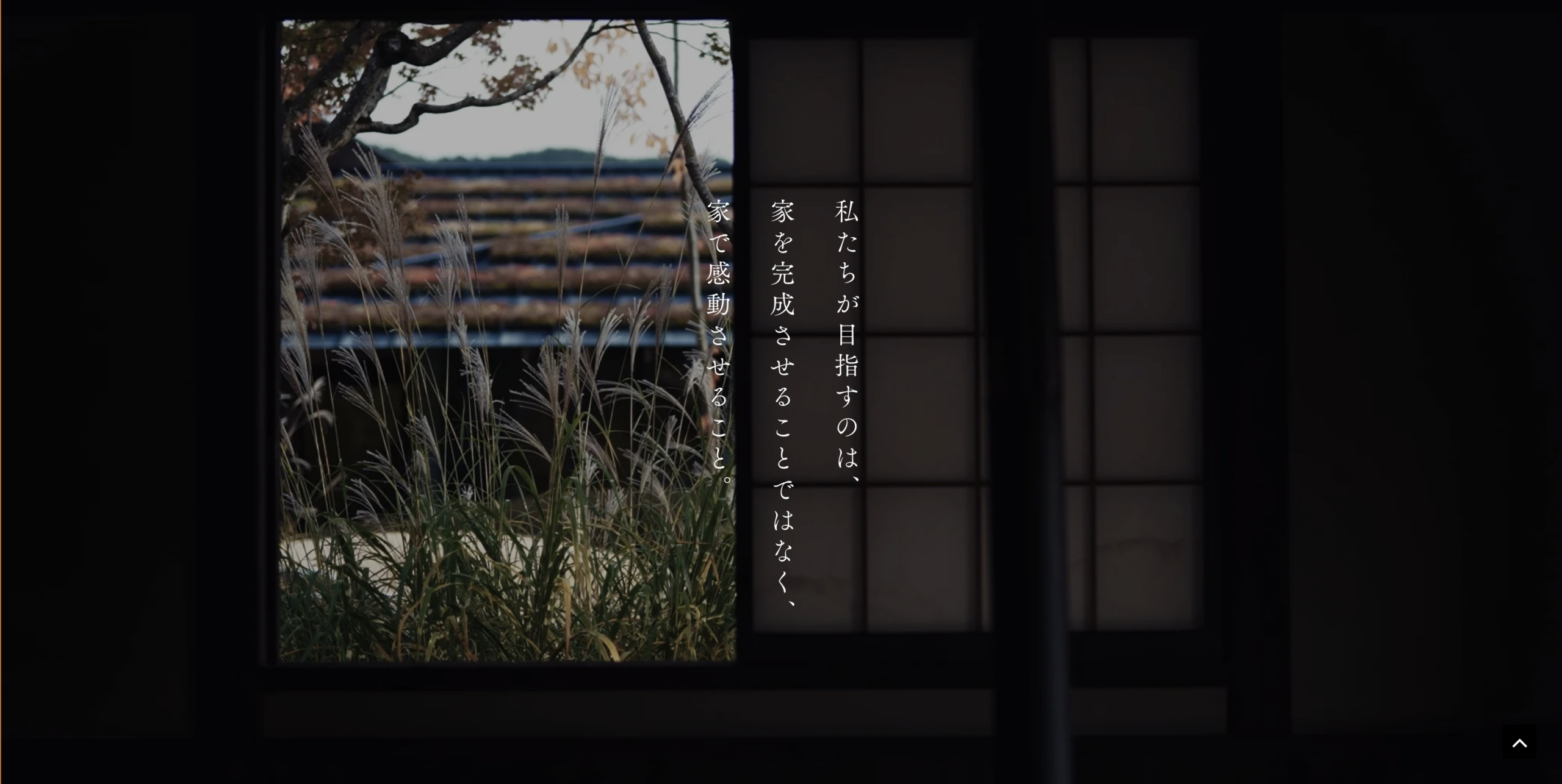 今回、使用する写真ですが、かなりこだわって居ります。ハウスメーカーやビルダー系の会社ですと、一家団欒している明るい写真が多いですが、今回はあえて暗めの写真を選択しています。日本の美意識には「陰影礼賛」という言葉がありますが、均一に明るい写真では伝わらない深みがあります。光の当たり方が美しい写真を厳選し、闇があるからこそ際立つ木の質感や、空間の奥行きを表現しました。色彩も全体的に彩度を落とし、モノクロに近いトーンで統一。これにより、華美な装飾を削ぎ落とし、本当の玄人を演出しています。見る人が思わず息を呑むような、静謐な世界観を表現してみました。