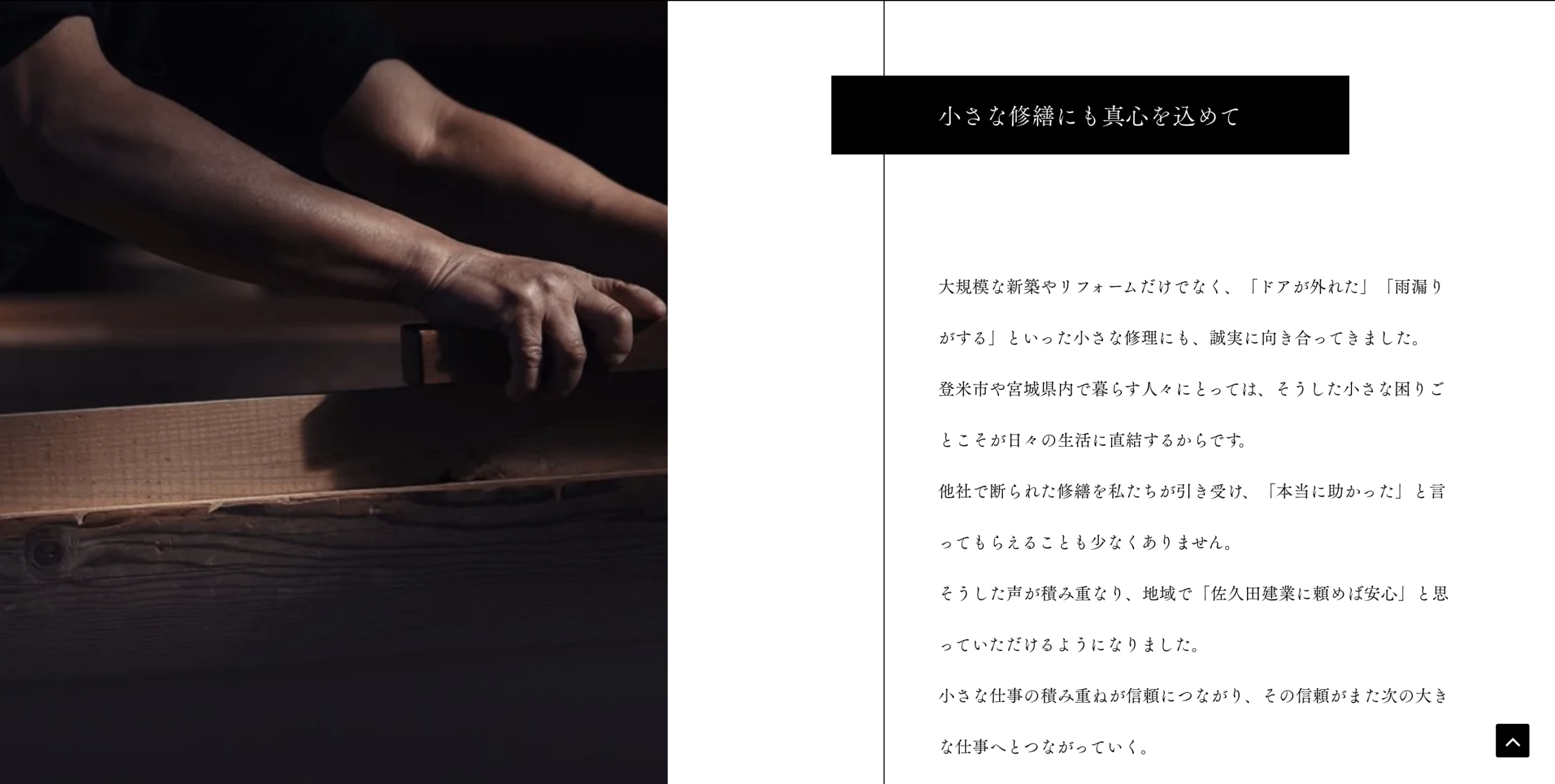 宮城県登米市で創業50年。佐久田建業様は、一般住宅の建築はもちろん、文化財や古民家の修繕まで手掛ける、生粋の職人集団です。大工や工務店のホームページというと、明るい青空と完成した家の写真…というのが一般的かもしれません。でも、佐久田建業様が持つ空気感は、もっと深くて重厚で、静かな熱量に満ちていました。