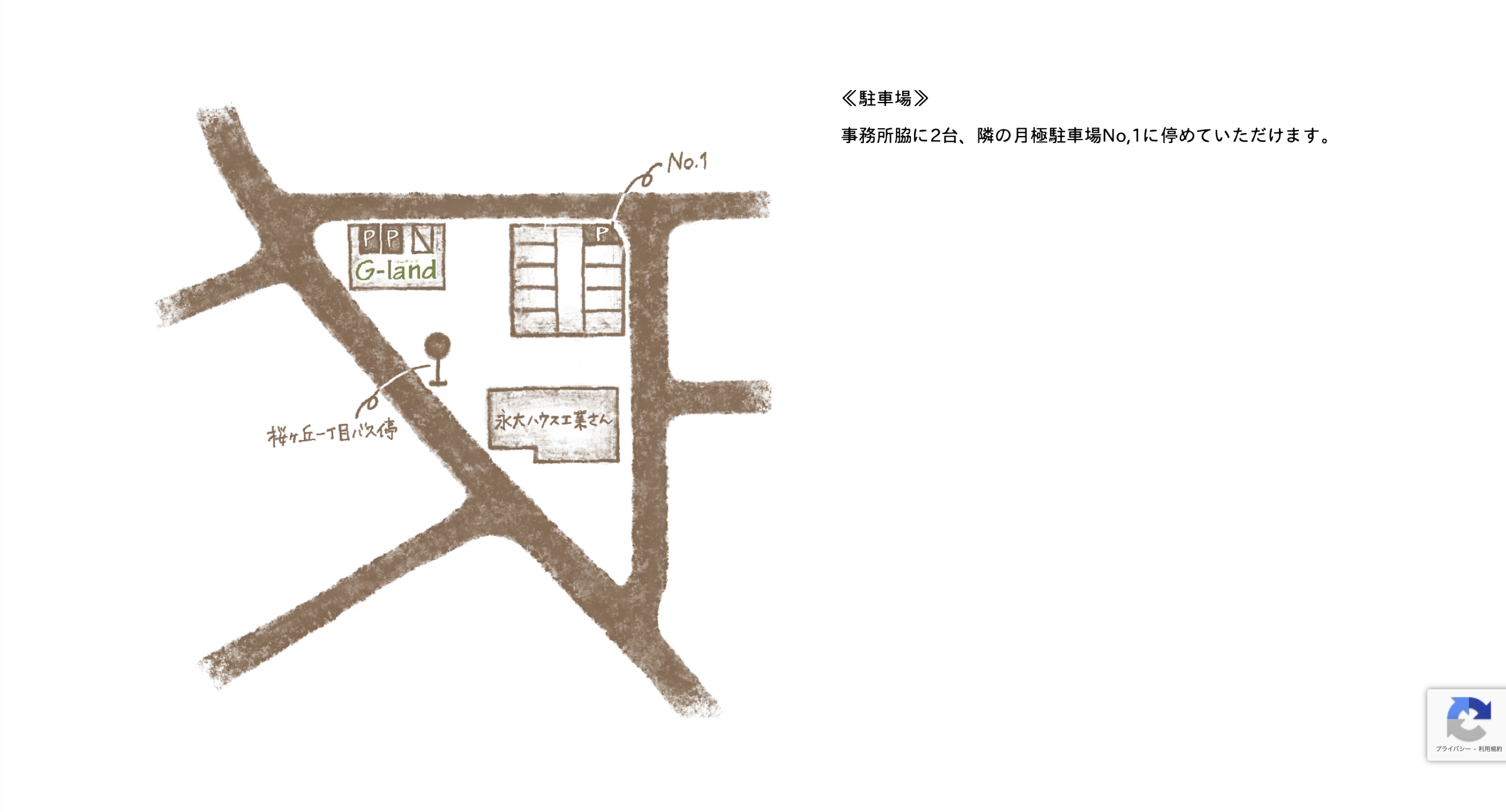 さらに、弊社社員が手がけた温かみのある手書きのオリジナルマップを掲載。ナビアプリでは味わえない、“訪れる前からちょっとワクワクする”ようなマップです。線の揺らぎややさしい雰囲気が、G-Land様の人柄や地域に根ざしたあたたかい空気感をそのまま伝えてくれます。
