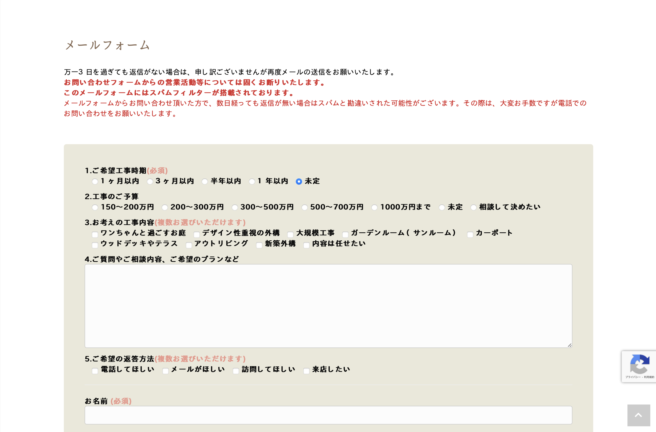 外構工事を検討されているお客様が、気軽にご相談を送れるように、メールフォームには工事時期・ご予算などを細かく指定できる項目を設けています。これにより、電話では伝えづらい内容もスムーズに共有でき、やりとりの初期段階から「想いが伝わる」コミュニケーションを実現しました。