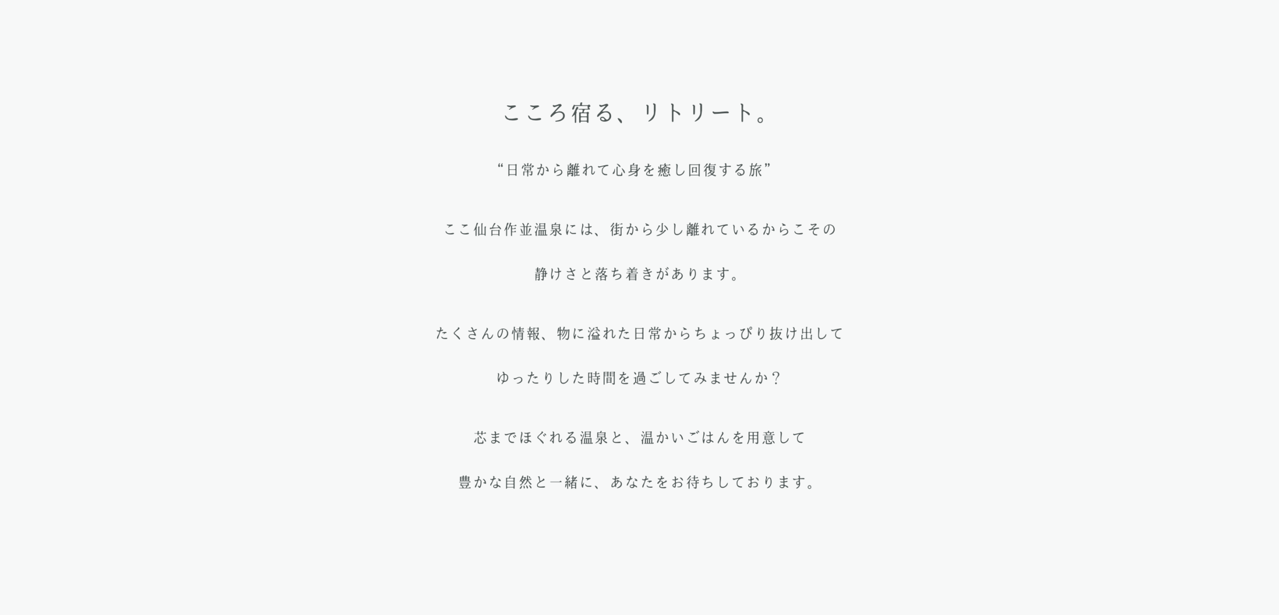 デザインは、余計な装飾を控え、素材の良さを引き立てるシンプルなつくりに。「引き算の美学」を意識しながら、作並温泉の魅力が自然と伝わるホームページを目指しました。